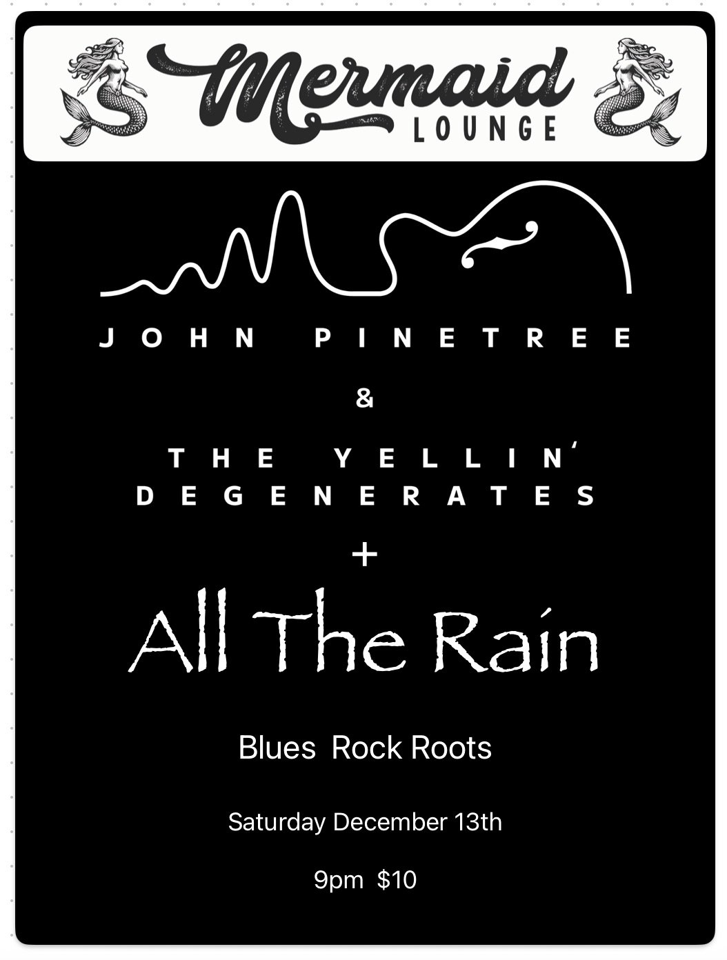 Back to All Events Mermaid Lounge Presents John Pinetree & the yellin’ degenerates with all the rain Saturday, December 13, 2025 9:00 PM 11:30 PM Google Calendar ICS