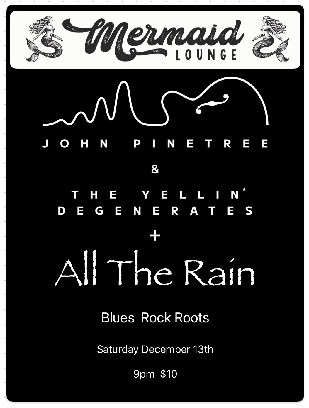The Mermaid Lounge Presents John Pinetree & The Yellin' Degenerates with All The Rain Saturday, December 13, 2025 9:00 PM 11:30 PM Google Calendar ICS